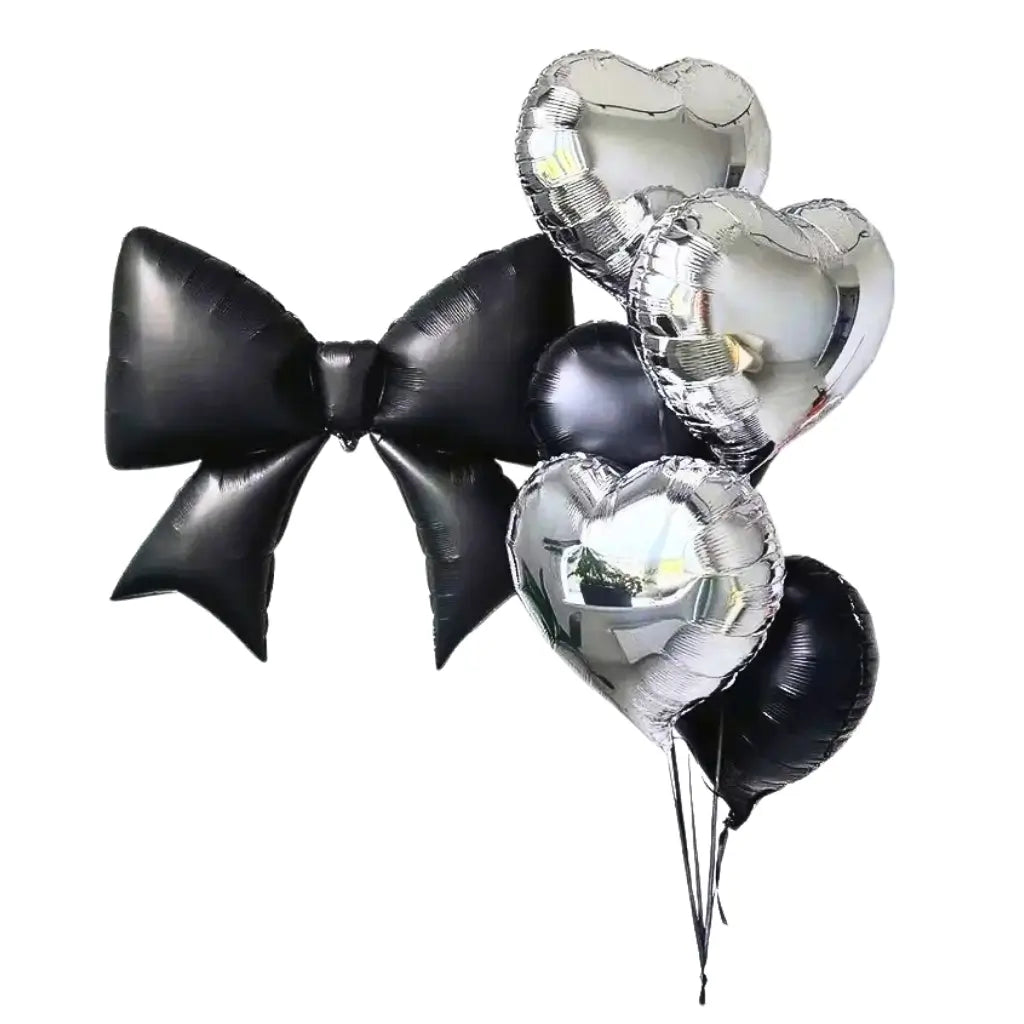 Create a bold and elegant party statement with this Luxe Jumbo Matte Black Ribbon Bow and Heart Foil Balloon Bundle. This stylish set includes one oversized black bow knot balloon, three 18-inch silver heart balloons, and two 18-inch matte black heart balloons for a modern monochrome look.
