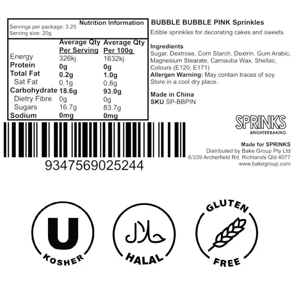 GiveyourdessertsawhimsicalpasteltouchwithSprinksPastelPinkBubbleBubbleSprinkles.Thischarmingmixfeaturesmattepastelpinksugarpearlsandtinyroundsprinklesinvarioussizes,perfectforaddingtextureandcolourtocakes,cupcakes,cookies,andchocolatetreats.